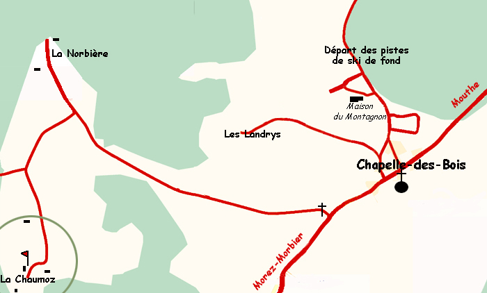 En venant de Mouthe, traverser le village après la mairie prendre à droite au calvaire, direction La Chaumoz, La Norbière.